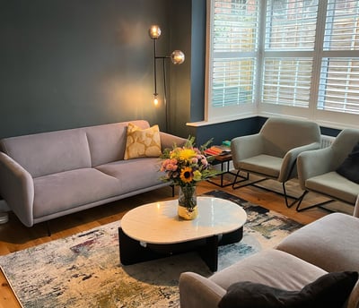 Projet: repenser l'aménagement d'une ancienne salle à manger en séjour et proposer un choix de décoration moderne et élégant en accord avec la peinture existante de la pièce. Créer un lien visuel harmonieux entre cette espace et la cuisine mitoyenne.