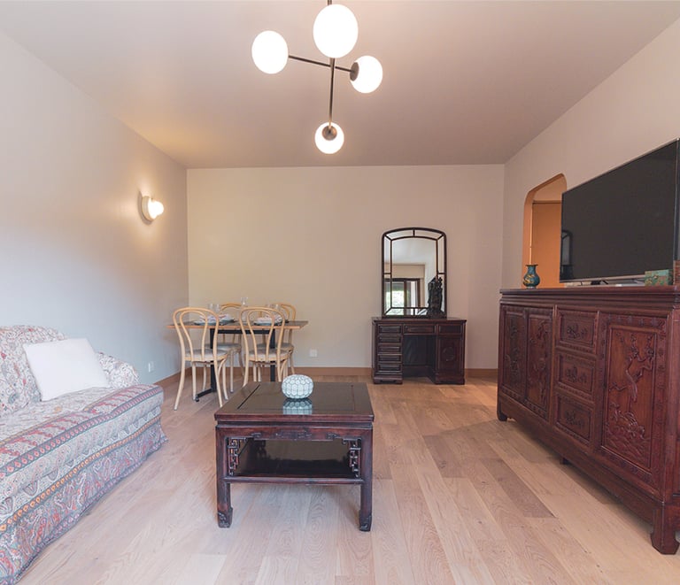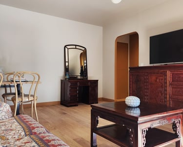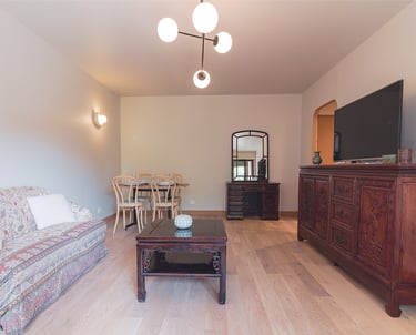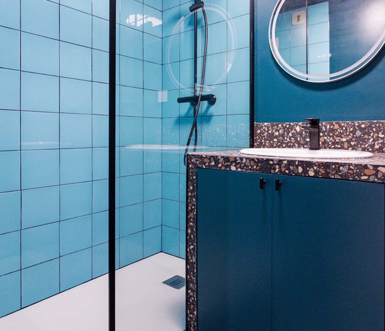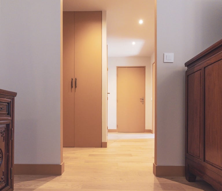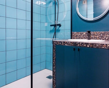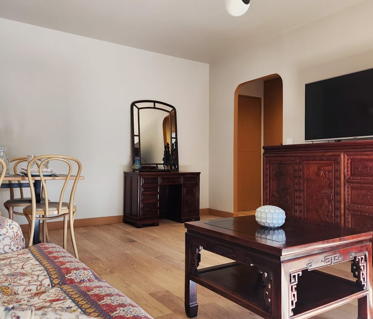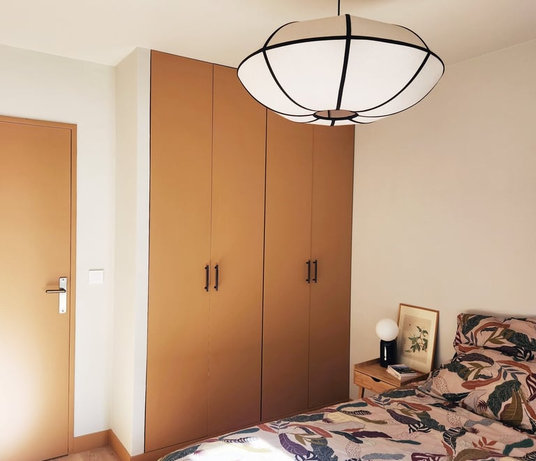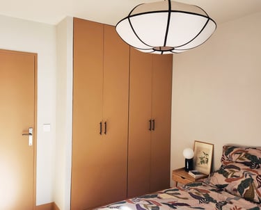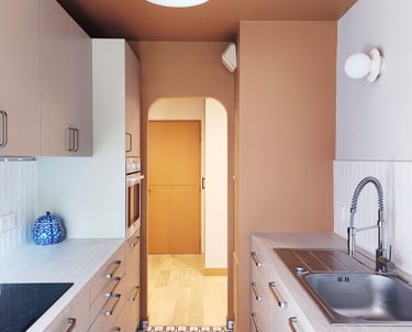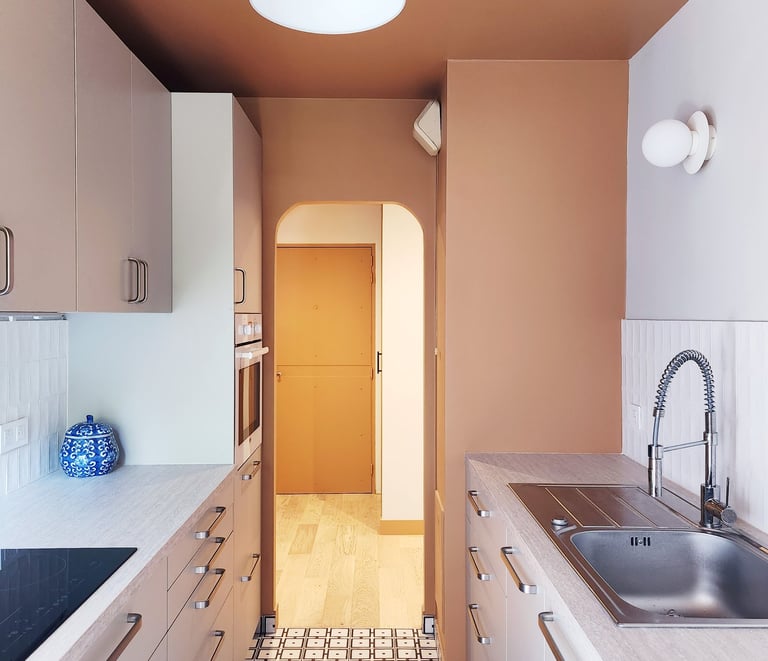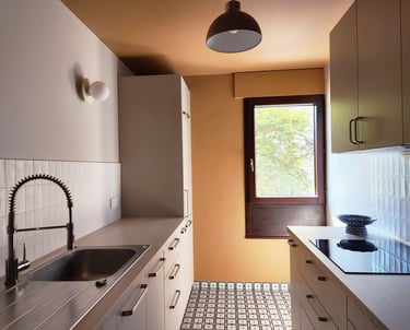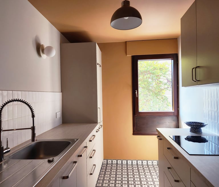Projet: rénovation complète avec suivi de chantier d'un appartement de 48 m² intégrant une étude Feng Shui dans la conception de l'espace. Optimisation de la circulation et des volumes, nouvel aménagement de la cuisine et de la salle d'eau tout en créant un style à la fois rétro et moderne. Création de rangements sur-mesure optimisés et qualitatifs. Recherche colorimétrique et réutilisation partielle de matériaux de seconde main pour la salle d'eau. Résultat : un intérieur singulier mêlant authenticité et modernité.